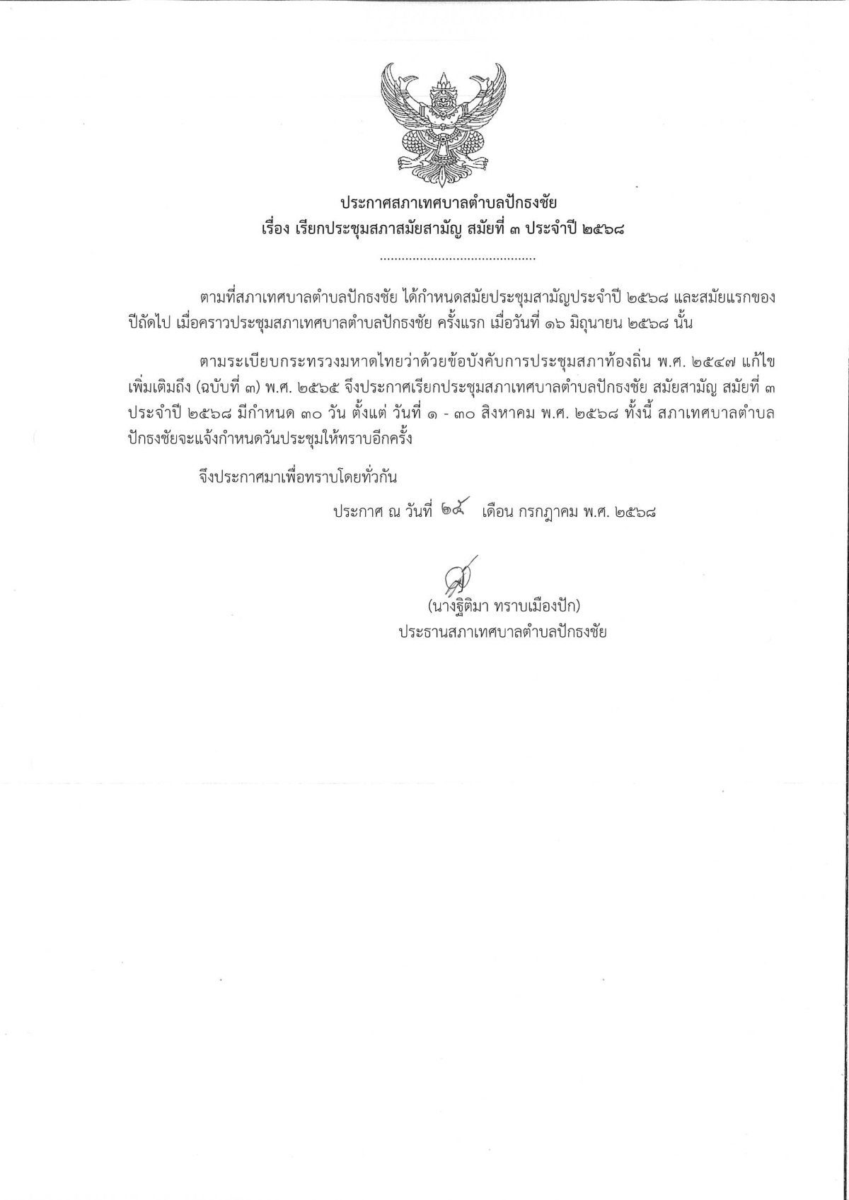 ประกาศสภาเทศบาลตำบลปักธงชัย เรื่อง เรียกประชุมสภาสมัยสามัญ สมัยที่ 3 ปี 2568
